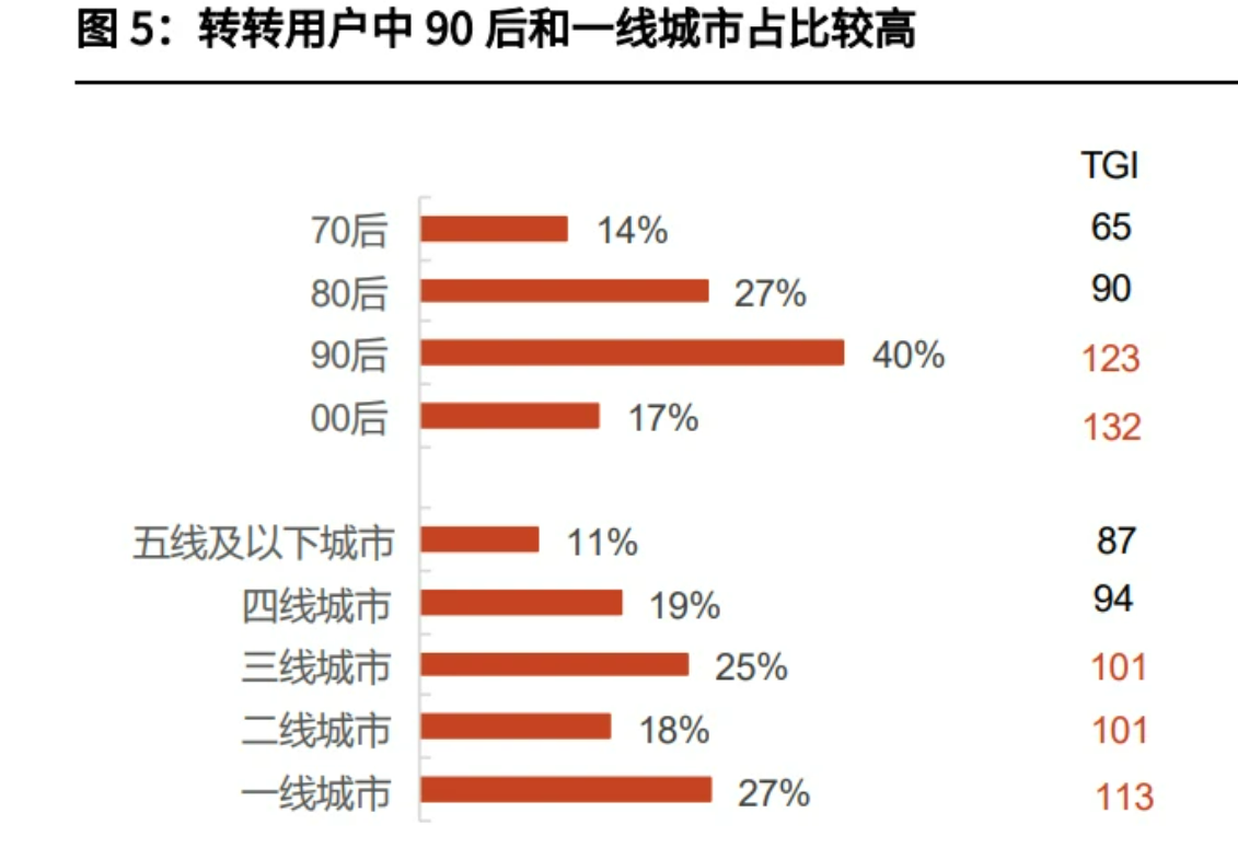 根据光大证券的统计,转转活跃用户中90后和00后占比合计接近60%,其中又有近50%的用户来自一线和二线城市。发达城市的年轻人,组成了国内二手电商交易市场的主力。而在这一批核心用户之外,转转、闲鱼们还很难撬动下沉市场、中年用户资源。