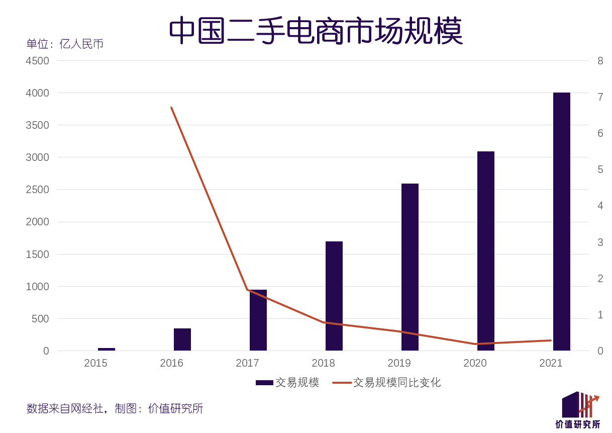 根据网经社今年年初发布的报告,截止2021年底中国二手电商市场交易规模达到4001.7亿元(不包括二手车等大件商品),同比增长29.27%。虽然增速日渐下滑,但和2014年闲鱼成立那会儿相比,如今的二手电商市场规模增长了整整10倍,成长速度绝对令人瞩目。
