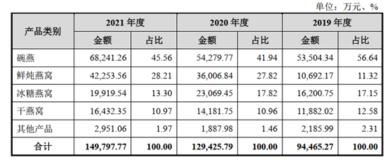 根据燕之屋招股书披露,2019-2021年,燕之屋分别实现总收入9.51亿元、12.99亿元、14.99亿元,其中碗燕分别实现营收5.35亿元、5.43亿元、6.82亿元,占总营收比重分别为56.64%、41.94%、45.56%,冰糖燕窝分别实现营收1.62亿元、2.31亿元、1.99亿元,占总营收比重分别为17.15%、17.82%、13.30%,鲜炖燕窝分别实现1.07亿元、3.60亿元、4.23亿元,分别占总营收的11.32%、27.82%、28.21%。碗燕、冰糖燕窝及鲜炖燕窝因其食用方便,颇受年轻人喜爱,这三者合计占燕之屋总营收的9成。