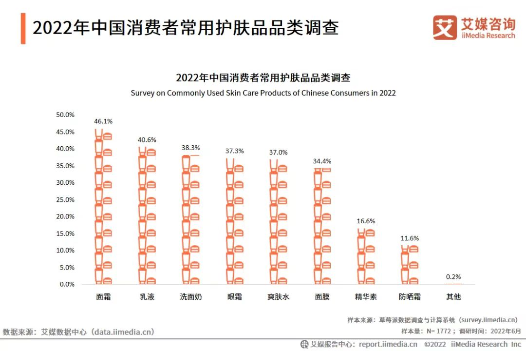 据艾媒咨询数据显示,2022年,中国消费者常用的护肤品品类较为分散,其中,面霜和乳液是受访者最常使用的产品类型,占比均超过四成。此外,洗面奶(38.3%)、眼霜(37.3%)、爽肤水(37.0%)、面膜(34.4%)也是消费者偏爱使用的护肤产品。