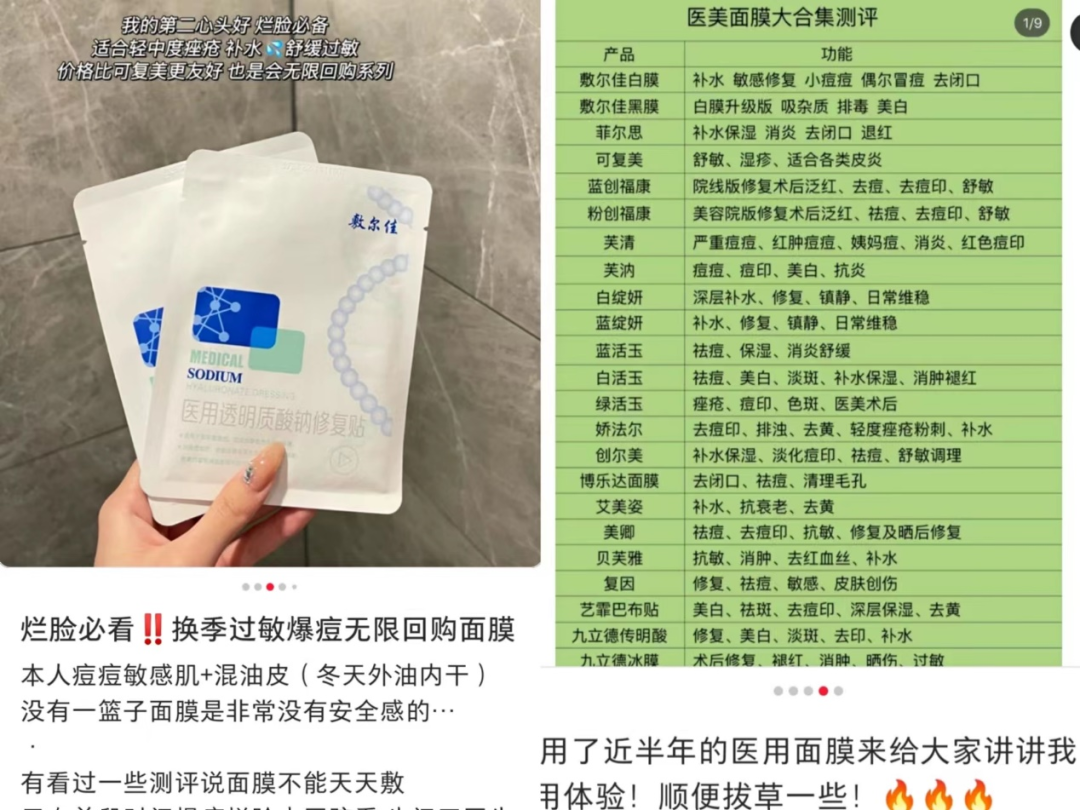 “医美面膜”的风其实已经吹了很久,最早可以追溯到2019年。锌刻度发现,在小红书上搜索“医用修复面膜”就有1万+篇笔记,搜索“医用”则有24万+篇笔记,而其中不乏有许多“大火”的医用面膜品牌,譬如可孚、敷尔佳、芙清、创福康、可复美、薇诺娜等,更有甚者,还将各面膜“定性”,譬如“痘肌必备可复美”“烂脸必备敷尔佳白膜”“肌肤补水第一名绽妍”等。