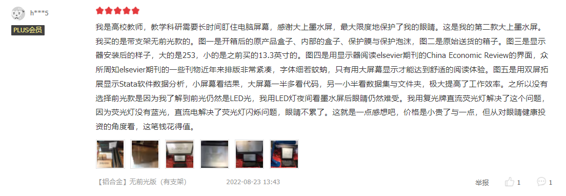小雷在京东平台大上科技Paperlike 253的商品评论区内看到,购买这款产品的很多都是硕博生、科研人员、程序员,以及需要长时间处理文本或图表内容的上班族。评论中出现最多的就是,换了墨水屏之后干眼症有显著改善,以前容易出现的眼睛酸涩肿痛问题,现在也好了很多。可见,对于真正有此需求的用户而言,墨水屏显示器对他们的帮助真的非常巨大。