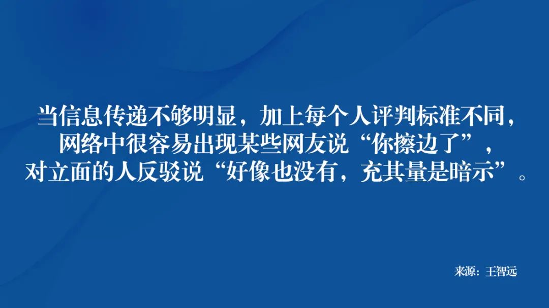 综上,你能看出,当信息传递不够明显,加上每个人评判标准不同,网络中很容易出现某些网友说“你擦边了”,对立面的人反驳说“好像也没有,充其量是暗示”。