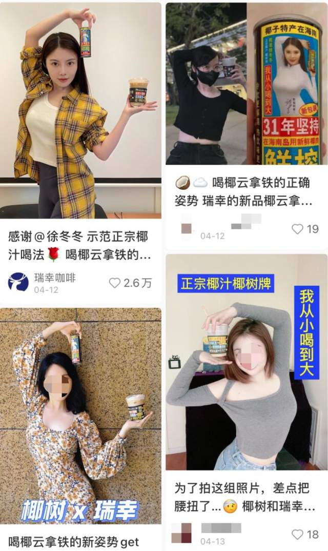 今年4月,椰树椰汁与瑞幸咖啡推出联名款椰云拿铁,定制杯套和纸袋也延续了椰树椰汁的包装,宣传语也延续为“从小喝到大气层”。这种“土到极致就是潮”的风格,在社交媒体上掀起了一股模仿椰树椰汁代言人摆拍的热潮。