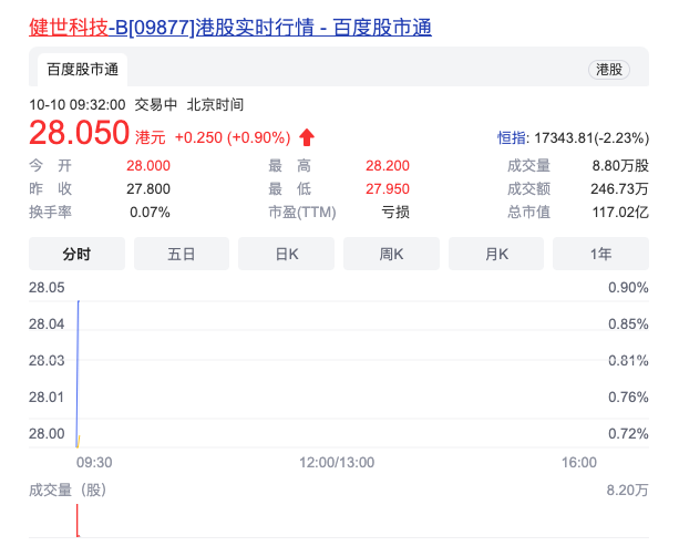 10月10日,宁波健世科技股份有限公司(以下简称“健世科技”)登陆港交所,发行价27.8港元/股,开盘28港元/股,涨幅达0.72%。截至发稿前,健世科技每股涨0.9%至28.05港元,总市值来到117.02亿。
