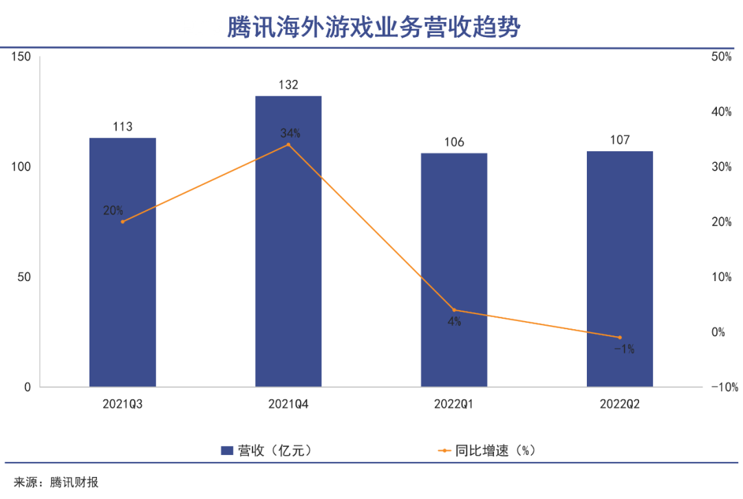 2021年的第三和第四季度,腾讯海外游戏业务增速高达20%和34%,但时间来到2022年,由于经济下行、疫情居家红利消退,海外游戏的增速也明显放缓。
