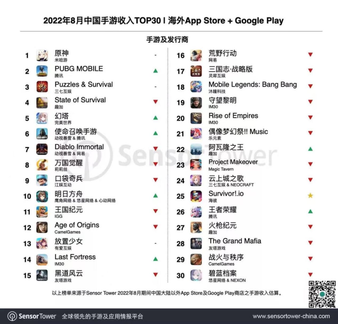 米哈游珠玉在前,海外市场逆势增长,腾讯势必会投入更多资源,并提高游戏出海的战略地位。如今年8月份,腾讯旗下《和平精英》国际版《PUBG Mobile》收入环比增长了21%,上升至第二名,其海外总收入已突破36亿美元(252.5亿元)。