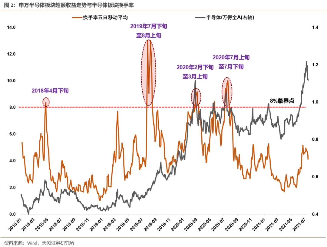 天风策略有一个研究,短期而言,如果热门赛道的换手率高于某一个经验数据,则大概率意味着该板块的短期见顶。2018~2021年,半导体板块换手率共有4次超过8%,新能源车板块换手率共有3次超过3%,每次突破后往往对应着板块阶段性见顶(当然,这只是一个短期信号,板块的大顶还是要靠基本面判断)。