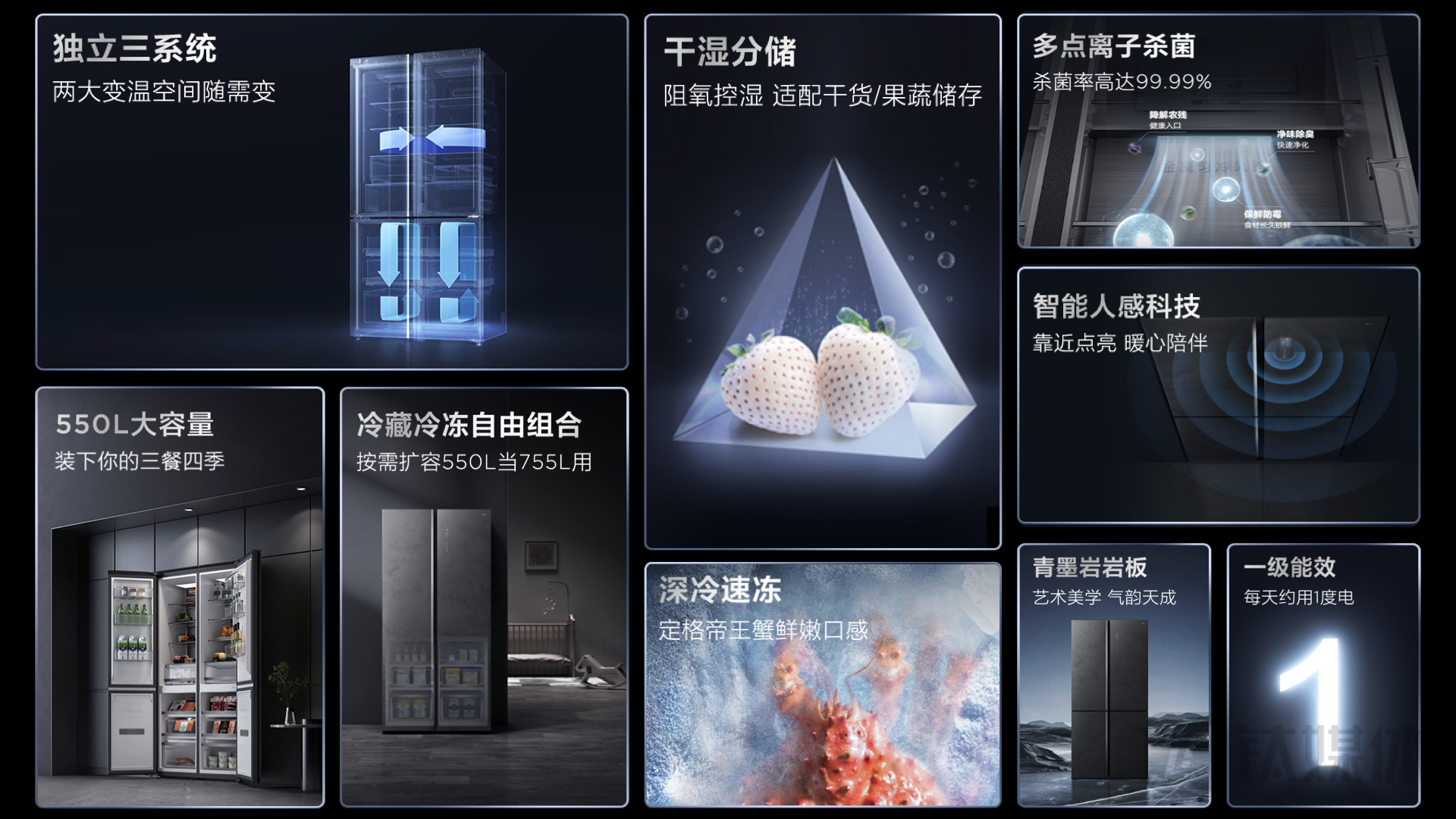 产品总体拥有555L容量,其中固定冷冻室160L,固定冷藏室185L,自由变温室210L。通过对温区之间的搭配,产品可以形成18种空间组合方式,可以满足不同用户、不同季节、不同食材的保鲜需求。产品首发价格为8999元。