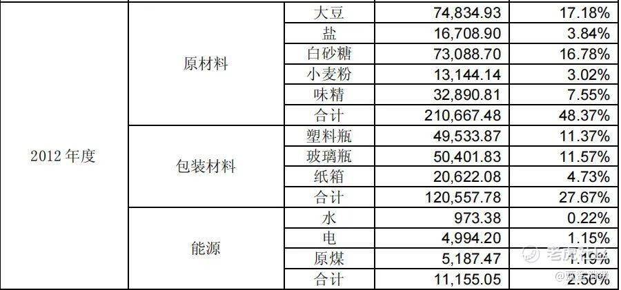 原料占海天产品总成本的比例在52%-54%之间。招股书透露,海天酱油的主要原料为大豆(黄豆和脱脂大豆)、白砂糖、小麦粉等,大豆占比在17%左右。同行千禾的核心原材料为豆粕(占比约16%)。