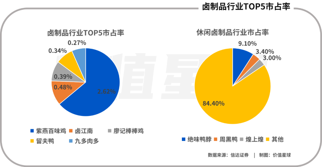 表面上看,这是一个高增速的市场,且又有大量资本支持,但实际上卤制品行业集中程度很低,佐餐卤制品的龙头紫燕食品2019年的市占率为2.62%,CR5加起来还不到5%;休闲卤制品的龙头绝味食品2021年的市占率为9.1%,R3则只有15%左右。