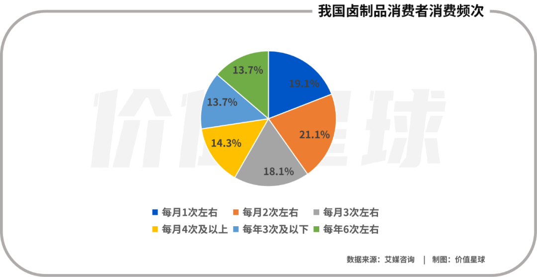 也正是由于这种“普世”的分类,卤制品在全国各地的餐桌上都有一席之地。据艾媒咨询数据,2021年有超过96.6%的人购买过卤制品,而且有超过90%的消费者喜欢购买卤制品。其中53.5%的消费者购买频次在每月2次及以上;33.9%的消费者单次消费金额高于40元。