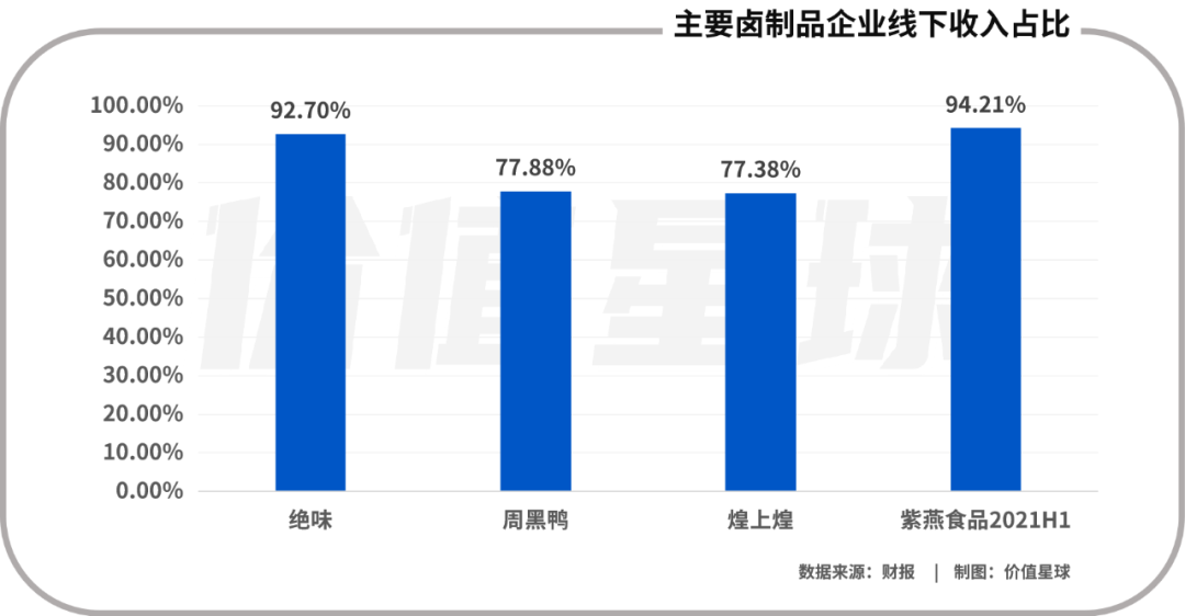 从营收占比来看,2021年休闲食品头部企业绝味食品、煌上煌、周黑鸭的卤制品业务收入分别有92.70%、77.38%、77.88%来源于线下门店。佐餐卤制品头部企业紫燕食品2021年H1的卤制品业务收入有94.21%来源于线下门店。