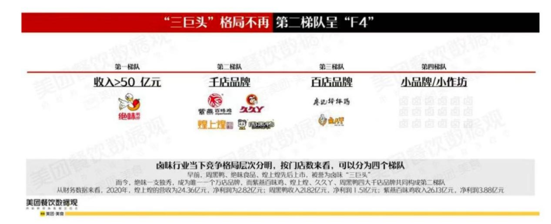 美团餐饮数据观发布的《2022年卤味品类发展报告》指出,“三巨头”格局不再,第二梯队呈“F4”——“早前,周黑鸭、绝味食品、煌上煌先后上市,被誉为‘卤味三巨头’,而今,绝味一枝独秀,成为唯一一个万店品牌,而紫燕百味鸡、煌上煌、久久丫、周黑鸭四大千店品牌共同构成第二梯队。”