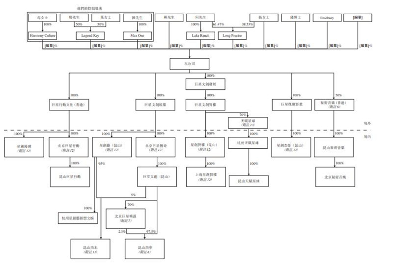 马心婷、杨峻荣、叶惠美、陈中、分别拥有公司已发行股本的27.63%、27.63%及9.21%。此外,巨星传奇的首席文化官,是台湾著名的作词人方文山,也是周杰伦的多年好友。