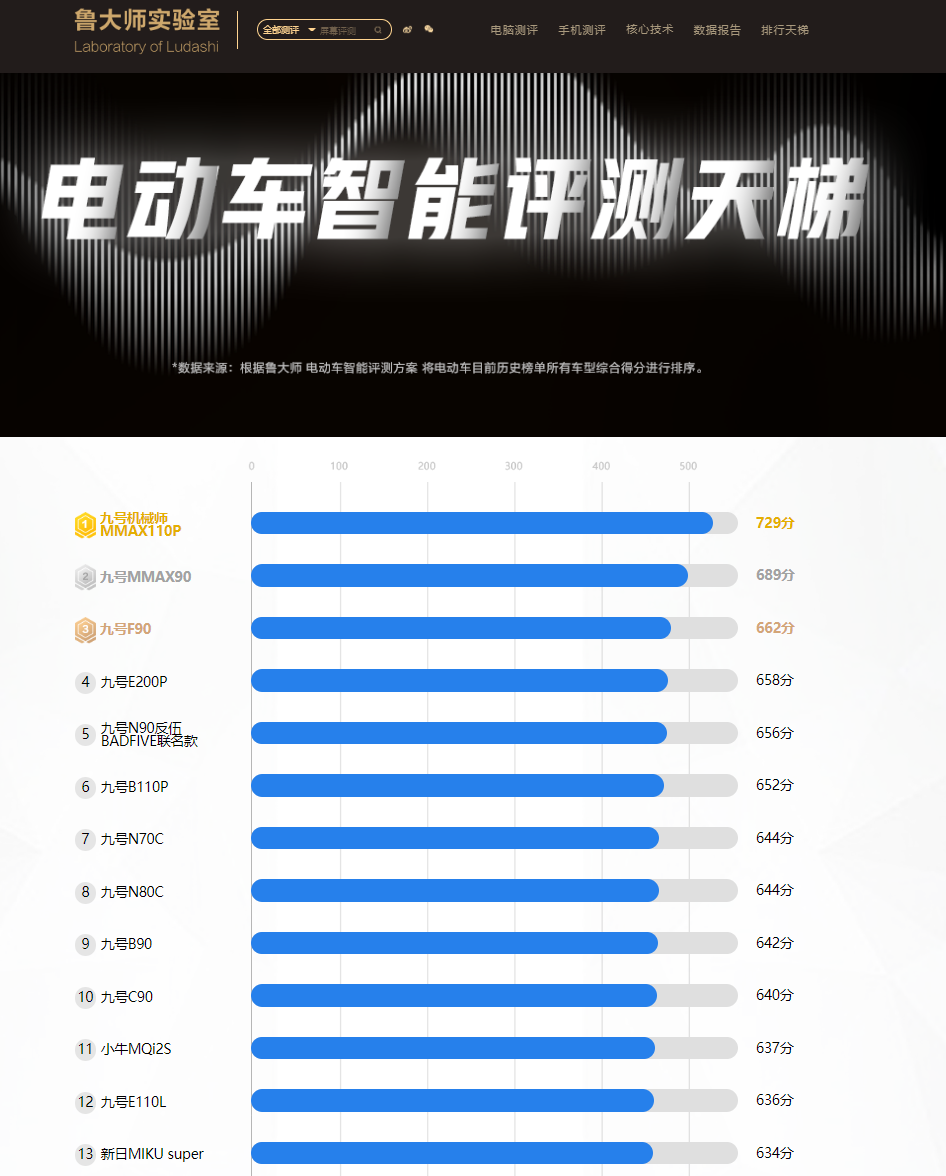 从鲁大师实验室评测结果可以看到,各家历史所有车型综合得分排名榜单上,前十名被九号公司的车型占据,见不到小牛产品的身影。![]()