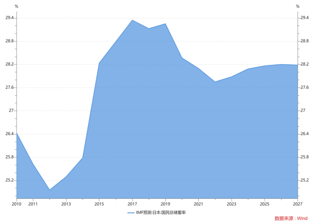 然而,宽松货币政策以及积极财政政策的实施并未多大程度提振消费和经济,日本国内经济持续疲软。据IMF(国际货币基金组织)数据,日本的国内储蓄率从2009年的约25%上升至2022年一季度的约28%,且IMF预计这一趋势还将延续。
