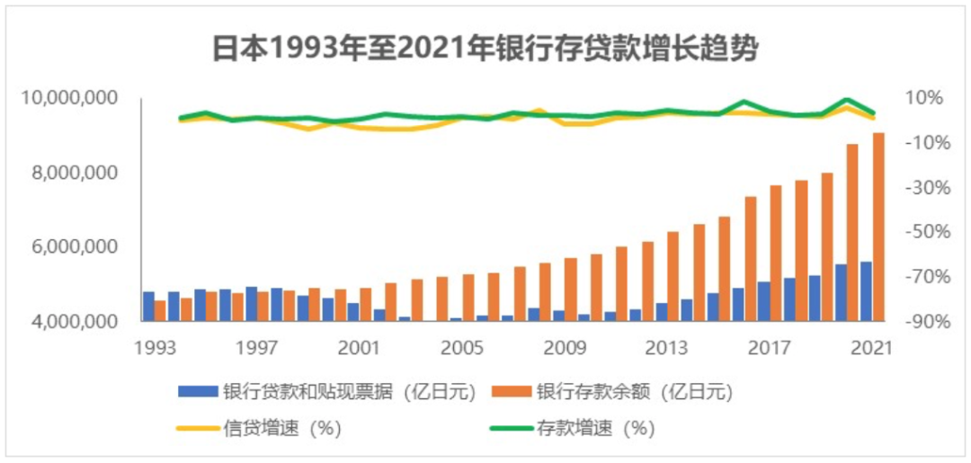 日本央行数据显示,从1993年至2021年,日本商业银行的存款增加了一倍至908万亿日元,期间贷款仅增长了17%至561万亿日元,整体来看,存款增长温和,信贷增长疲软。