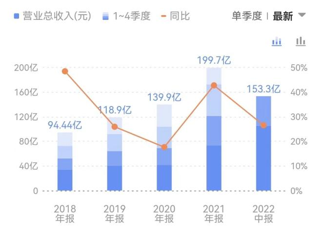 山西汾酒2018年至2022年上半年的营业收入为94.44亿元、118.9亿元、139.9亿元、199.7亿元、153.3亿元,一路追赶营收超越了泸州老窖。