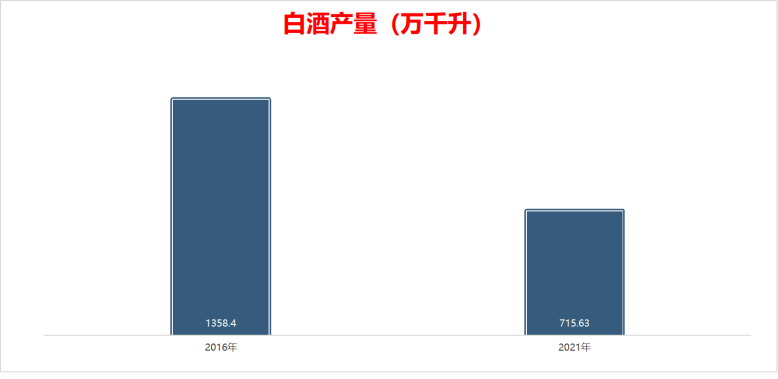 据国家统计局的数据显示,2021年中国白酒行业规模以上企业合计产量为715.63万千升,比2020年减少了25.07万千升,已连续五年萎缩,相比2016年整体萎缩了47.32%。