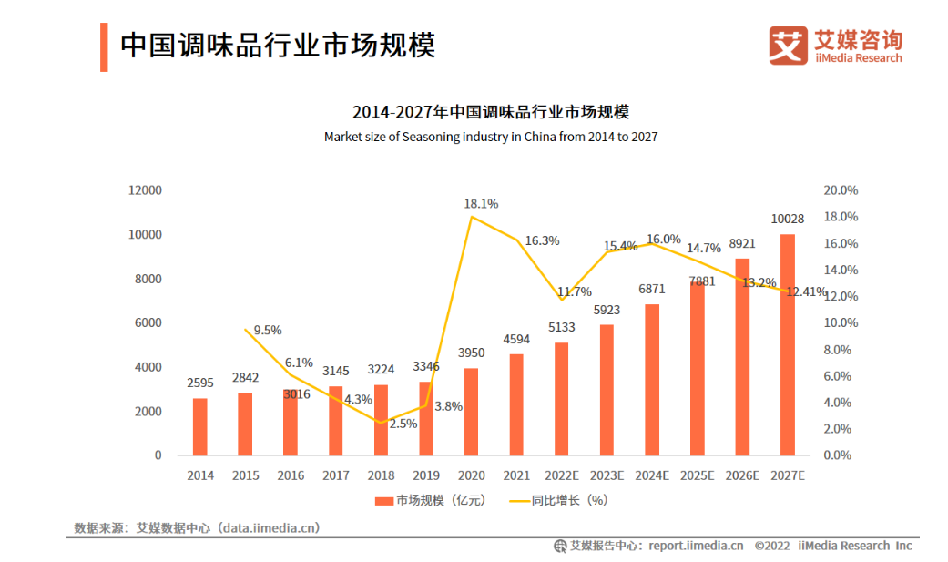 艾媒咨询统计的数据显示,2021年中国调味品市场规模达到4594亿元,预计在2022年底增长至5133亿。该机构预计,2020年至2027年,国内的调味品市场将保持两位数增速,酱油、醋、耗油等传统产品的统治地位无可动摇。