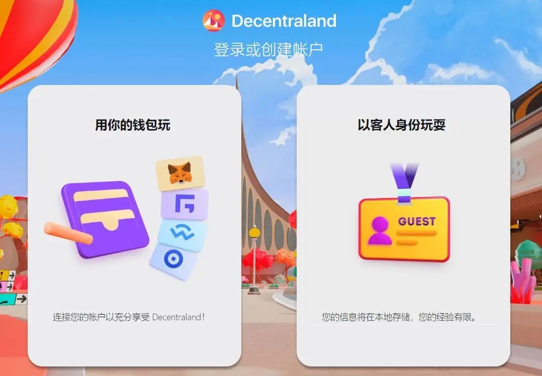 但登录 Decentraland 的门槛并没有那么高。如果你是第一次访问 Decentraland,需要做的是打开官方网站,单击右上角的「开始探索」,连接你的加密钱包,或仅以访客身份登入。