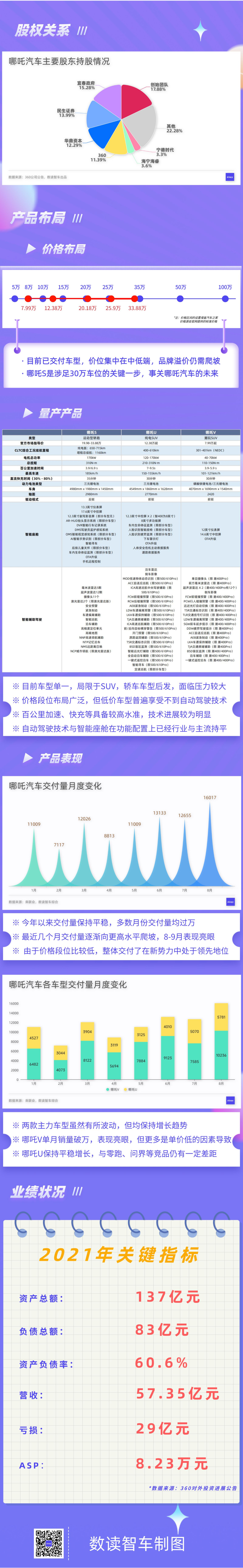 而且,价格越低,注定营收和利润越稀薄,在早期并不容易挣到钱。哪吒暂时没上市,从股东360披露的数据看,截至2021年底,哪吒汽车资产总额137亿元,负债总额83亿元,资产负债率60.6%,安全但处于高位。2021年度其营业收入57.35亿元,亏损29亿元。2020年和2021年哪吒汽车共亏损超过42亿元。