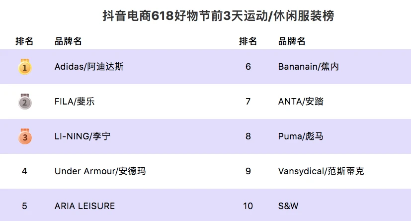 早期和抖音牵手的阿迪达斯,就像过去的优衣库之于淘系,为抖音开拓服装品类打头阵。今年618好物节前3天的运动休闲服装榜上,阿迪达斯、斐乐、李宁等品牌霸榜,和同期天猫的运动服装榜单上榜品牌无异。优衣库目前在抖音平台处于起步阶段,但直播频次和时长并不亚于其他品牌,“掌上优衣库”账号不到一个月涨粉40多万。