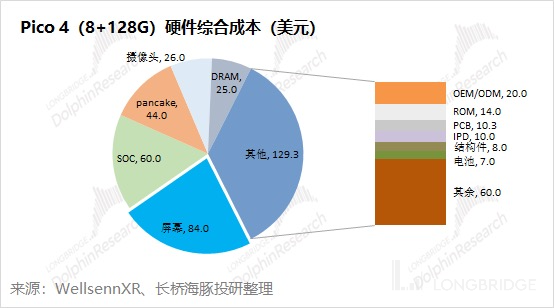 对于设备端创新也最主要围绕这三项,本次发布的Pico Neo 4 SOC 芯片仍采用市场上最多的高通 XR2 芯片,屏幕采用 JDI/群创的 fast-LCD 面板,pancake 光学模组来自歌尔股份,其余器件对整机成本影响较小。