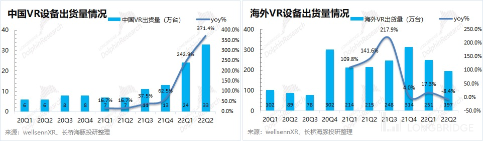 由于 Oculus 2 年来都未发新品,VR 整体增速看似下滑明显。但由于 Oculus 需要使用 Facebook 的账号,海豚君从国内外分市场看。海外市场目前仍 Oculus 主导,由于 Oculus 未发新品,直接导致海外市场 VR 销量不太增长。而国内市场目前主要由 Pico 引领,在被字节跳动收购后,通过产品力提升和促销的策略,直接引爆了国内 VR 市场。