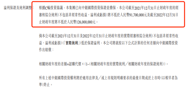 在C轮融资的时候,公司与投资方之一的中银国际签订了一份业绩对赌协议,保证并担保公司2021、2022财年经审核综合纯利(不包括非经常性收益、溢利和亏损)分别不低于9170万元及1.26亿元。