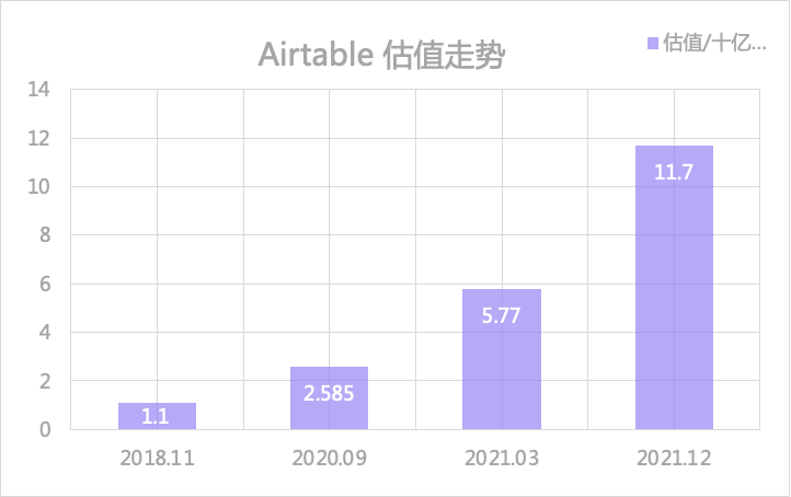 在2021年3月E轮融资时,Airtable的ARR约为8500万美元,预计2021年底这一数字能达到1.15亿美元,在获得了Silver Lake Partner等机构投资的超过7亿美元的融资后,Airtable估值甚至飙升到117亿美金,超过了Notion的103亿。
