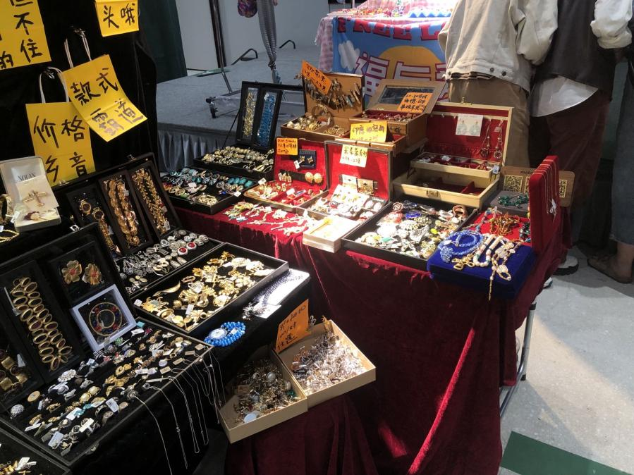 他售卖的货物都是自己花费时间去其他旧货市场淘来的,杨浦、宝山、黄埔和静安这些旧货市场,他每月会去两三次。淘完货物后将新旧物件、珍珠项链等分类摆放,最后一起摆在杨浦跳蚤市场的地摊上售卖。