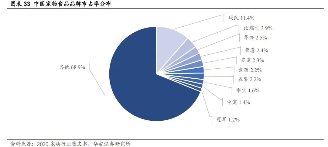 一个现实是,国内的宠物食品市场,品牌集中度并不高。根据华安证券数据,2020年排名第一的品牌为玛氏,但其占比不到12%,中宠股份的占比则是1.4%,排在第8位。