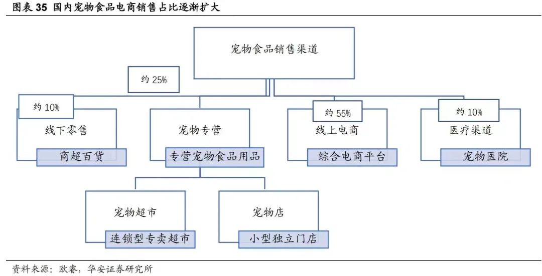 根据欧睿数据,中国宠物食品销售渠道中,线上占比超50%,宠物店25%,商超渠道约10%,线上宠物食品品牌数量超过了400个。