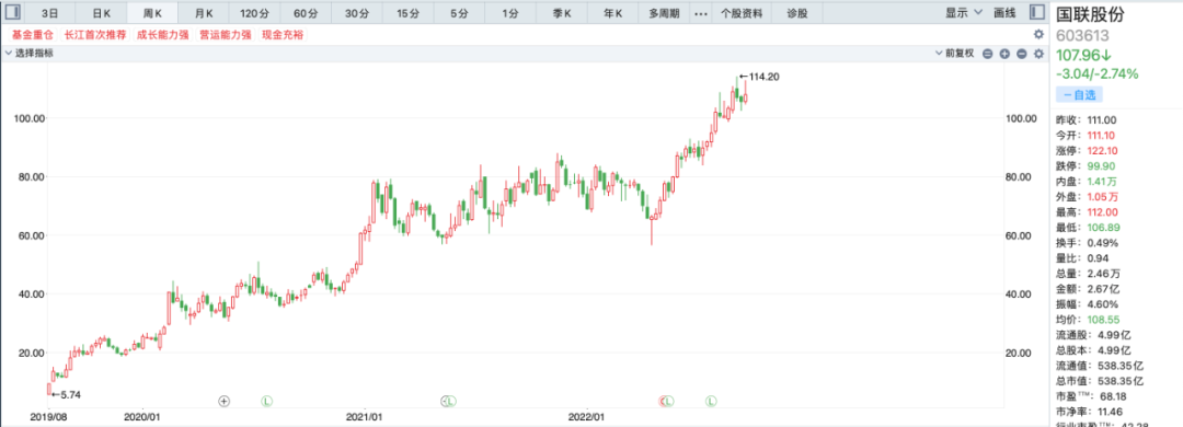 以从事工业原材料产业互联网交易平台的国联股份(603613)为例,在2019年上市时名不见经传、不过20亿市值。三年之后,国联股份已成长为550亿人民币市值的A股产业互联网第一股,并正在迈向千亿市值。