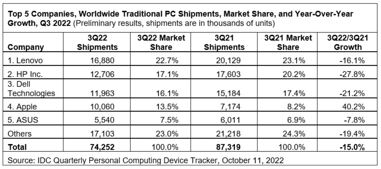 正如前文所说,来到三季度这几家PC厂商的日子同样不好过。根据IDC的报告,三季度出货量排名前五的厂商只有苹果实现逆市增长,联想、惠普、戴尔、华硕全都同比下滑,跌幅最高的惠普出货量同比大跌27.8%。