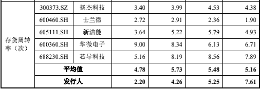 与此同时,长晶科技存货周转率持续走低。招股书显示,前述报告期各期,公司存货周转率分别为7.61次、5.25次、4.26次、2.2次。与同行相比,长晶科技这一指标也没有优势。招股书显示,同期行业存货周转率平均水平分别是5.16、5.48、5.73、4.78。除了2019年,其它报告期内,长晶科技存货周转率均低于行业平均水平。
