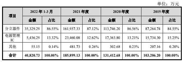 虽然长电科技从2020开始退出长晶科技前五大客户,但长晶科技已打上了长电科技的烙印。招股书显示,从长电科技承接而来的分立器件业务为长晶科技贡献了大部分收入,2019年-2021年以及2022年一季度,该类产品实现的销售收入在其主营业务收入中的比重分别达 84.55%、86.56%、87.12% 及 86.55%,均超过八成。
