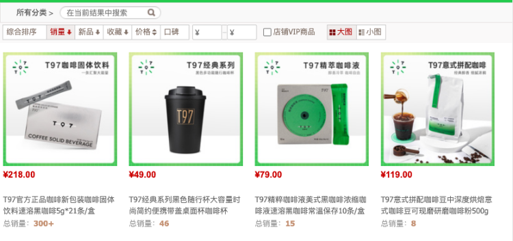 按照与上文相同的截止日期来测算,自2021年5月便上线的T97天猫旗舰店总共只有1793个粉丝、四个SKU,全品类销量加起来还没超过500。咖啡豆的销量更是只有个位数,甚至还不及衍生产品咖啡杯的销量。