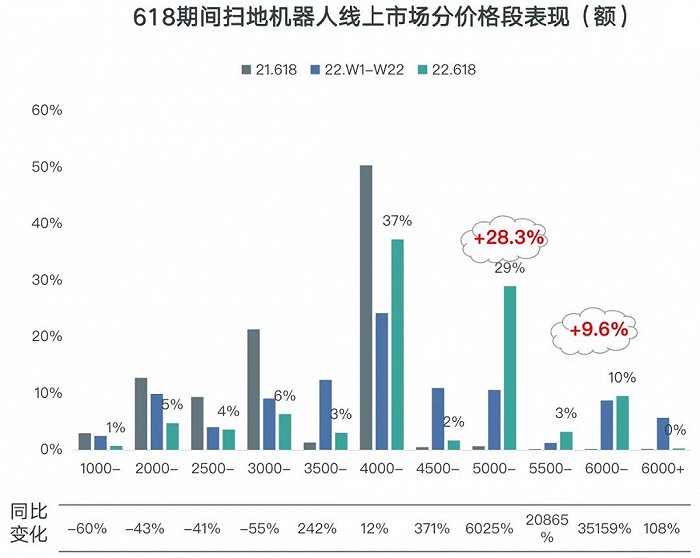 根据GfK中怡康的《2022年618吸尘器市场简析》报告,今年1-5月,扫地机器人的销售额同比上涨19.6%,从去年同期的34亿元增长至40亿元,市场呈现价增量减之势。报告显示,今年618期间,扫地机器人4500元以上的市场增长明显,其中又以“5500元-6000元”价格区间的增长最为显著。