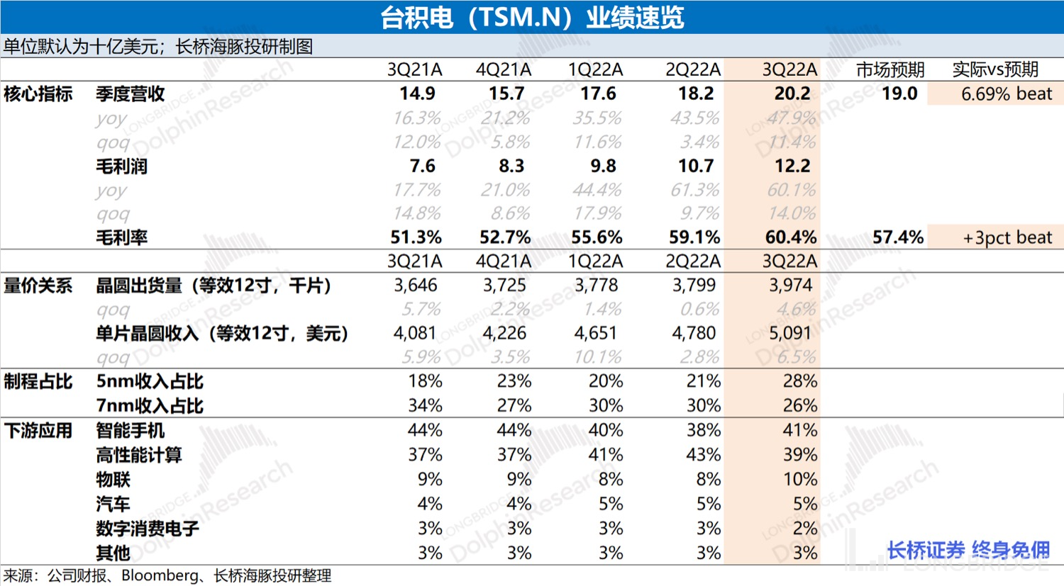 1、收入端:周期下行中的 alpha。三季度$台积电.US 收入实现 202.3 亿美元,符合指引预期(198-206 亿美元)。季度收入的环比增长,其中出货量的维度带来贡献 +4.6%,出货均价的维度带来贡献 +6.5%。收入端的量价齐升,主要受益于$苹果.US 新机拉货提升了对 5nm 制程的需求;