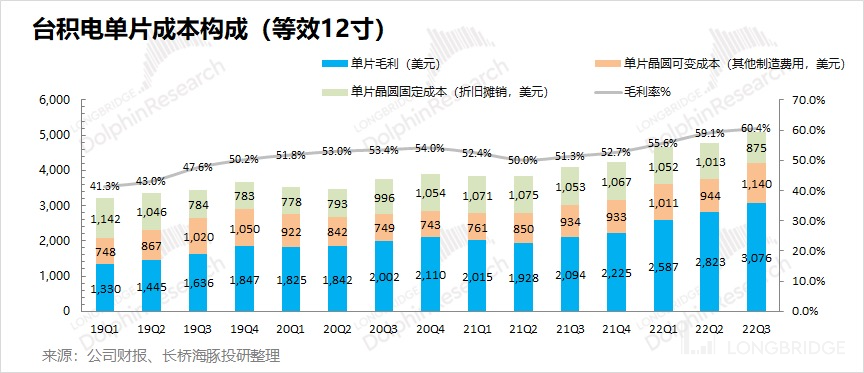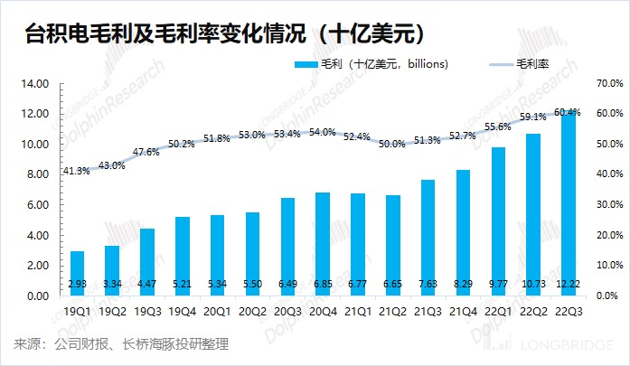 台积电在 2022 年第三季度实现毛利 122.2 亿美元,环比增长 14%。环比增速高于收入增速(11.4%)的原因,主要在于毛利率的超预期提升。其中三季度台积电的毛利率 60.4%,超指引区间上限(57.5-59.5%)。