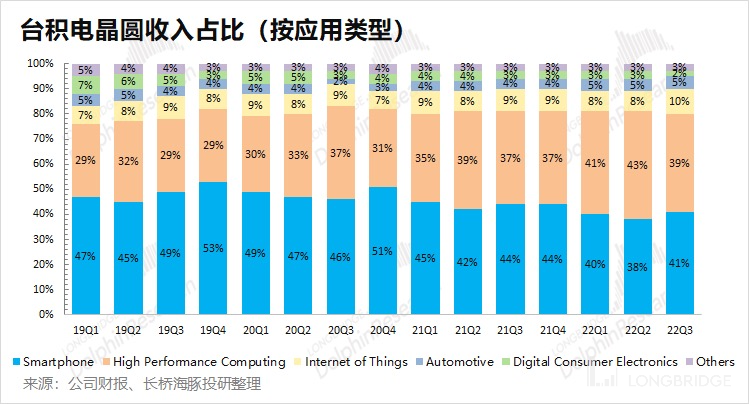 智能手机和高性能计算仍是台积电最大的应用来源,两者合计占比达到 80% 以上,也对公司业绩影响最大。
