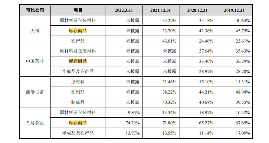 值得一提的是,随着销售规模的扩大,线上、线下直营以及加盟渠道的快速扩张,公司存货规模呈上升趋势,报告期各期末,存货账面价值分别为 2.09亿、3.2亿、3.5亿、3.8亿,占总资产的比例分别为 27.81%、35.48%、26.77%和 29.55%,若出现部分存货因市场需求变化而导致价格下降或出现滞销等情况,则公司需对该等存货计提跌价准备或予以报损,从而对公司财务状况和经营成果产生不利影响。具体来看,八马茶业存货中的库存商品占比显著高于同业可比公司,报告期内,八马茶业的存货中库存商品的占比分别为67.65%、65.27%、71.80%和74.29%,呈逐年增长趋势,而天福(06868.HK)、中国茶叶等同业公司的指标均维持50%以下,差距明显。