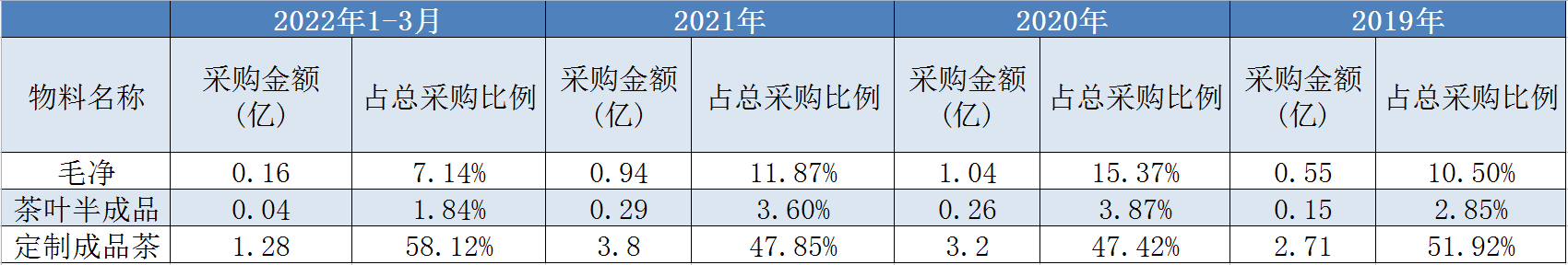 然而,亮眼的业绩背后,八马茶业面临自主生产比例低的问题。具体来看,八马茶业采购端主要可以分为自主生产、自主分装和定制采购三种模式。招股书显示,公司生产模式以定制采购为主,报告期内,公司采购定制成品茶的金额分别为2.71亿、3.2亿、3.8亿、1.28亿,占采购总额比例分别为51.92%、47.42%、47.85%、58.12%,相比之下,自主生产采购的原材料毛净、需要自主分装的茶叶半成品,其采购占比都远低于定制成品茶。值得一提的是,自主生产模式需要公司深度参与拼配、烘焙等精制程序,需要资深技术优势,目前仅铁观音及部分岩茶等乌龙茶为自主生产。从业务重点来看,公司更倾向于仅负责制作、包装的定制产品,与中国茶叶和澜沧古茶均以自主生产为主的茶企相比,这种类似于“贴牌”的业务模式并不利于未来品牌发展。食品分析师朱丹蓬表示,八马茶业有一定的品牌打造能力,但产业链完整度尚显不足,需要在这方面持续深耕。有行业人士认为,茶业特别注重产地效应,为主八马茶业没有自己的种植基地,也没有独特的茶源地,存在一定的经营风险。