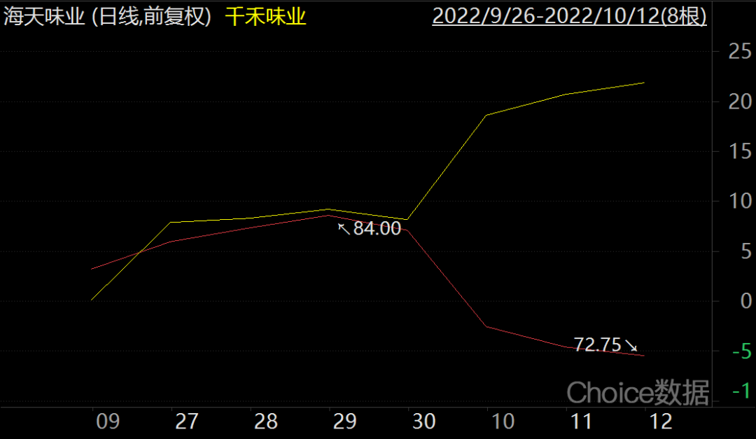 图:海天千禾近期走势,红:海天 黄:千禾,来源:Choice金融客户端