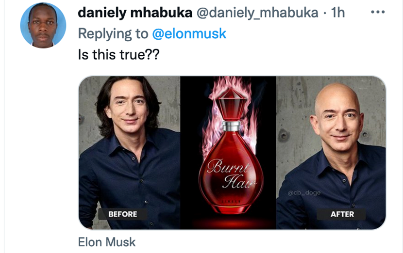 不光有好心人为马斯克奉上自己做的香水广告图,图里马斯克的脑袋被安在了一个肩膀宽阔、肱二头肌瞩目的模特身体上,让人仿佛能听到电视广告里那种神秘的低语:“burnt hair……”。