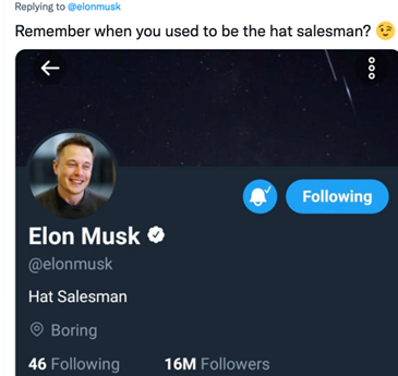 这是一张截图,马斯克的推特简介写着“帽子推销员”,这名网友大概是个“老粉”,彼时的马斯克在推特还只有1600万关注者。