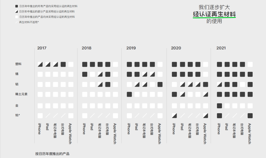 这主要体现在公司的产品开始规模性地使用再生来源的稀土、钨、金和钴。(此前两年,苹果使用的再生材料集中在大宗的塑料、铝、钢、铜、锡等。)